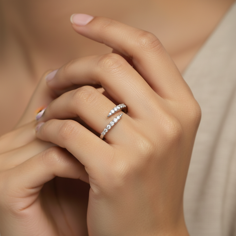 De Éclat Zilvere Wrap Ring is een verfijnde, verstelbare ring ontworpen voor vrouwen die houden van moderne elegantie en stille luxe.