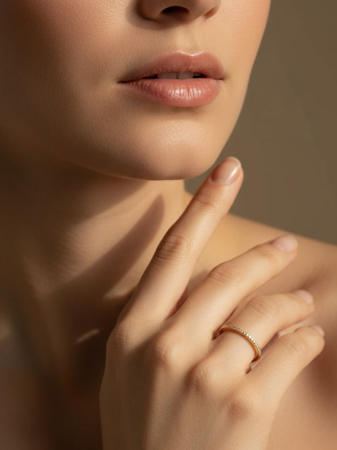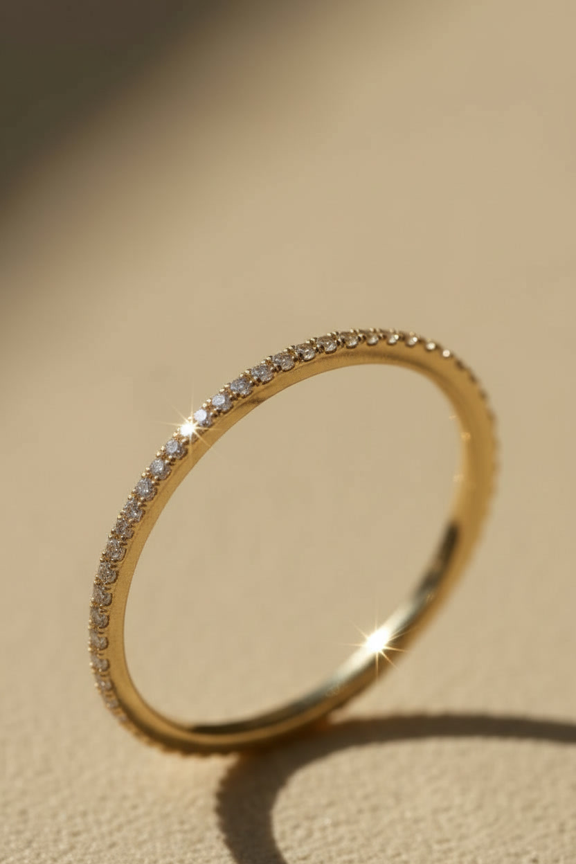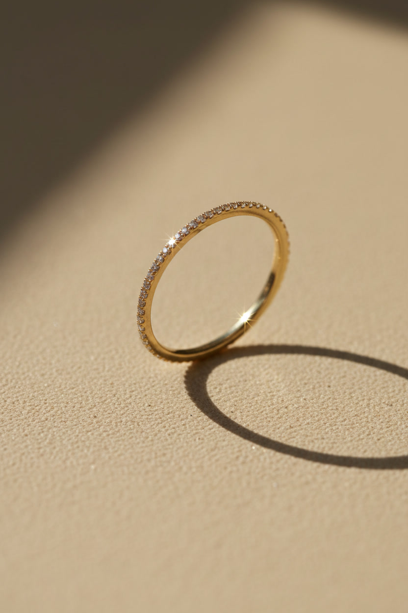 De ring combineert tijdloze finesse met modern minimalisme: een slanke band, zorgvuldig gezet met rhinestone-grade AAA zirconia, die het licht op een zachte en luxe manier vangt.